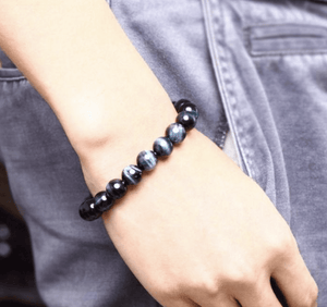 Ce magnifique bracelet tout en Oeil de Faucon est composé de perles qui émanent une luminosité chatoyante due à la réflexion de la lumière par leur structure fibreuse.